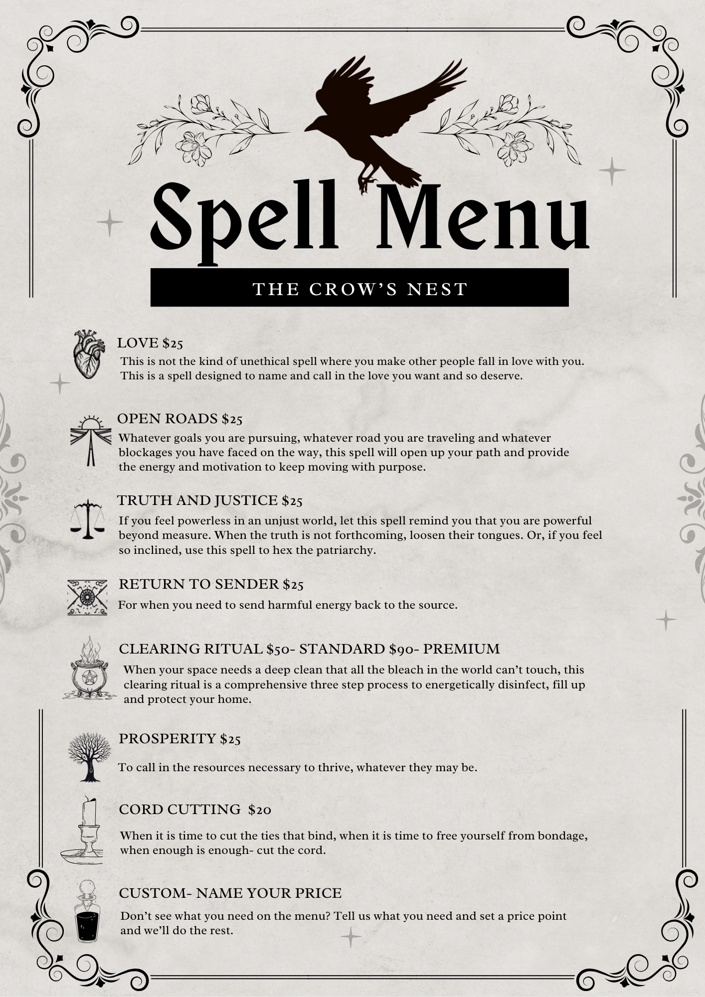 It has always been our mission to make magic as accessible as possible and to create community so no one has to walk the road alone. So with that in mind, the spell menu was born. Simply make your selections from the menu below and we will provide the ingredients, instructions and any other guidance or support you may need to get to work!